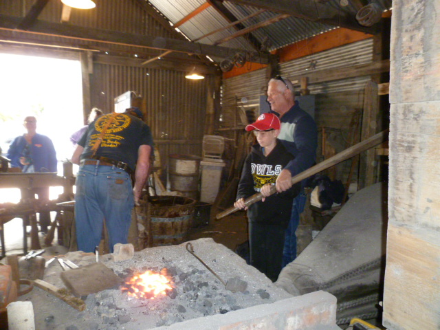 We had a great run today to the Angaston Heritage Blacksmith Shop & Museum. Our events people organised beaut weather, but one willy boundary rider. A boofhead of a bloke took some of us up and around Menglers Hill backroads and a long long way around to get to Agnaston. Apologeees from him. The Blacksmith workshop was very interesting with our events director doing her thing by pumping the bellows for the fire as the blacksmith made a toy for the grandies of Joe & Sue and also an iron flower was made for the Bywater mob. After a good look over the Museum as well, we drove down to the Vine Inn at Nuri where we had a Bonza Lunch. Thanks to the Events Managers, the Bywaters and also our Secretaries, the Dimeses ( who were too crook to attend this outing) Hope that they get well soon .